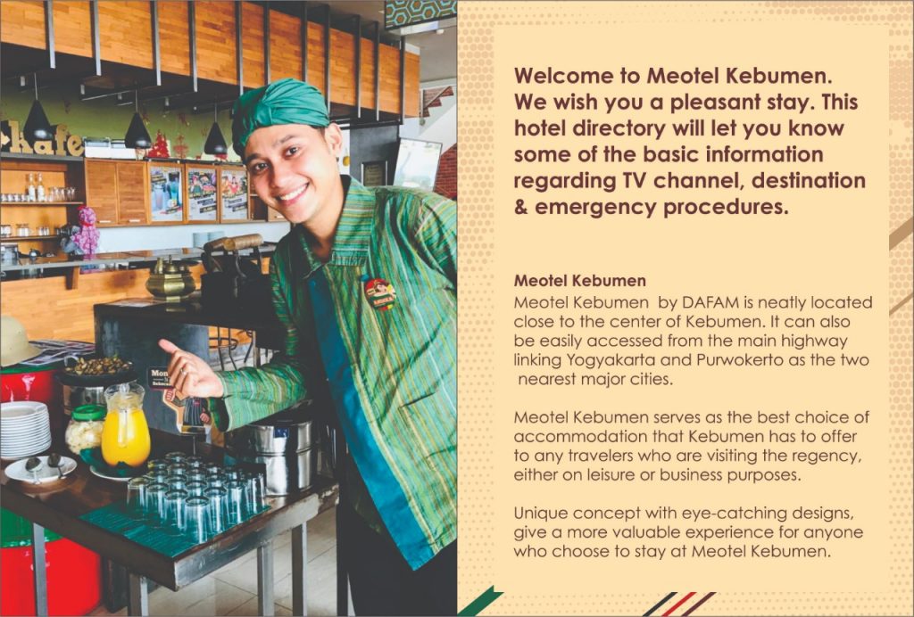 Hotel Meotel KebumenSelamat datang di Meotel Kebumen. Semoga Anda selalu menyenangkan dalam menginap. Hotel direktori ini memandu Anda tentang informasi dasar mengenai channel TV, tempat wisata, dan prosedur darurat.Geopark Karangsambung KarangbolongGoa Jatijajar dan Benteng Van Der WijckPantai Menganti dan Bukit Pentulu IndahLayanan untuk tamu dan keamananProsedur keamanan pada gempa bumi dan kebakaranProsedur keamanan pada banjir, Channel TV